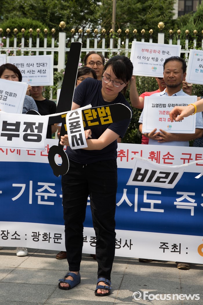 (서울=포커스뉴스) 8일 오전 서울 종로구 정부서울청사 정문 앞에서 열린 김영란법 무력화시키는 기준완화 시도 중단 촉구 기자회견에서 경제정의실천시민연합(경실련) 회원이 퍼포먼스를 선보이고 있다.