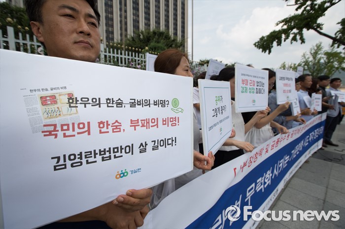 (서울=포커스뉴스) 8일 오전 서울 종로구 정부서울청사 정문 앞에서 경제정의실천시민연합(경실련) 회원들이 김영란법 무력화시키는 기준완화 시도 중단 촉구 기자회견을 하고 있다.
