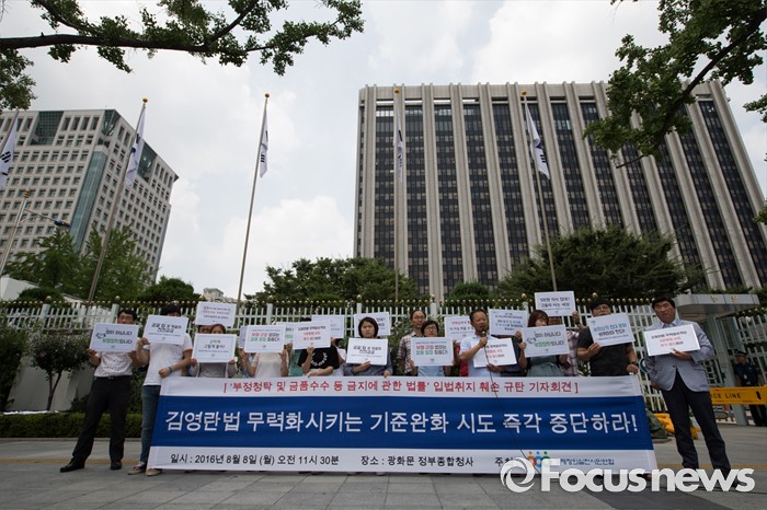 (서울=포커스뉴스) 8일 오전 서울 종로구 정부서울청사 정문 앞에서 경제정의실천시민연합(경실련) 회원들이 김영란법 무력화시키는 기준완화 시도 중단 촉구 기자회견을 하고 있다.