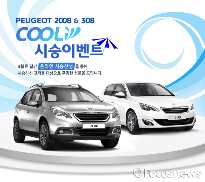 (서울=포커스뉴스) 푸조의 공식 수입원인 한불모터스는 8월 한 달간 전국 푸조 전시장에서 인기 소형 SUV 모델 푸조 2008, 프렌치 해치백 모델 308을 직접 경험할 수 있는 '쿨(COOL) 시승 이벤트'를 연다고 8일 밝혔다.