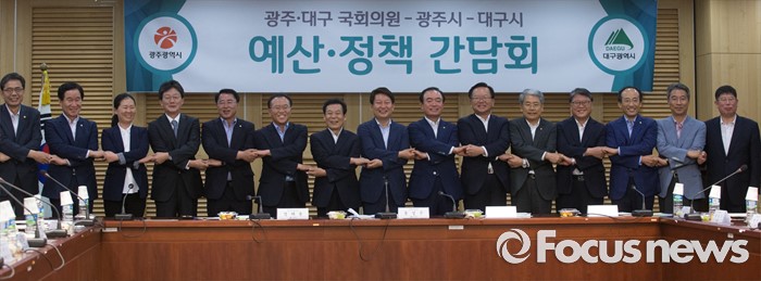 (서울=포커스뉴스) 8일 오후 서울 여의도 국회 의원회관에서 열린 광주시-대구시 예산·정책 간담회에 참석한 윤장현 광주시장, 권영진 대구시장, 윤재옥 새누리당 대구시당 위원장, 김동철 국민의당 광주시당 위원장 등 의원들이 기념촬영을 하고 있다.