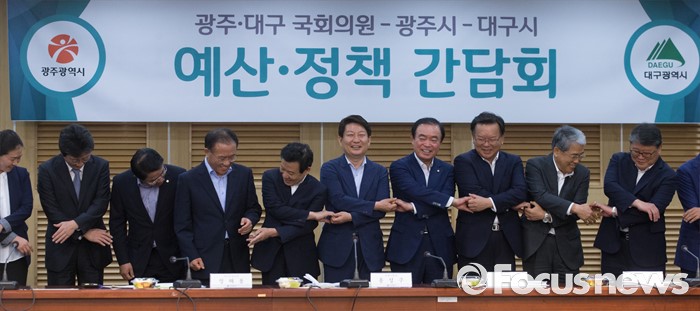 (서울=포커스뉴스) 8일 오후 서울 여의도 국회 의원회관에서 열린 광주시-대구시 예산·정책 간담회에 참석한 시장 및 의원들이 기념촬영을 하고 있다. 왼쪽부터 권은희 국민의당 의원, 유승민 새누리당 의원, 최경환 국민의당 의원, 윤재옥 새누리당 대구시당 위원장, 윤장현 광주시장, 권영진 대구시장, 장병완 국민의당 의원, 김부겸 더불어민주당 의원, 김동철 국민의당 광주시당 위원장, 조원진 새누리당 의원.