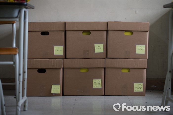 (안산=포커스뉴스) 세월호 참사에서 희생된 단원고등학교 학생들의 교실 이전 절차가 시작된 8일 오후, 경기도 안산시 단원고등학교 기억교실에 4.16 기억 저장소 관계자들과 자원봉사자들이 정리한 유물상자가 보이고 있다.