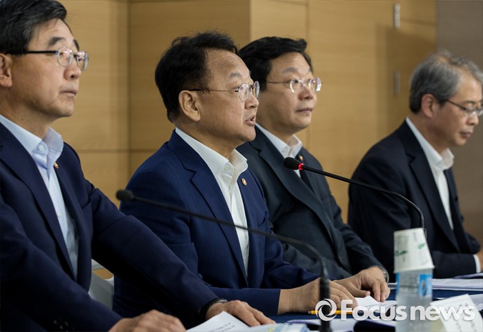 (서울=포커스뉴스) 9일 오전 정부서울청사에서 열린 '2016년 추경예산안 국회 조기통과' 관련 합동브리핑에 참석한 유일호(왼쪽 두번째) 경제부총리 겸 기획재정부 장관이 호소문을 발표하고 있다.