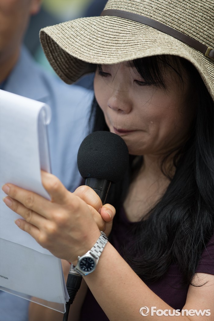 (서울=포커스뉴스) 9일 오전 서울 종로구 광화문광장에서 열린 시민사회단체연대회의 '갑을오토텍 사태의 평화적 해결과 상생을 위한 대화 호소 기자회견'에서 갑을오토텍지회 조합원 가족이 호소문을 낭독하며 눈물을 흘리고 있다.
