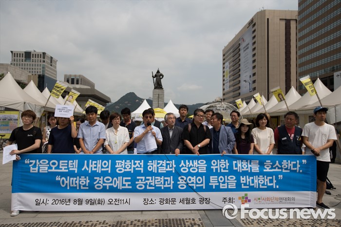 (서울=포커스뉴스) 9일 오전 서울 종로구 광화문광장에서 시민사회단체연대회의 회원들이 '갑을오토텍 사태의 평화적 해결과 상생을 위한 대화 호소 기자회견'을 하고 있다.