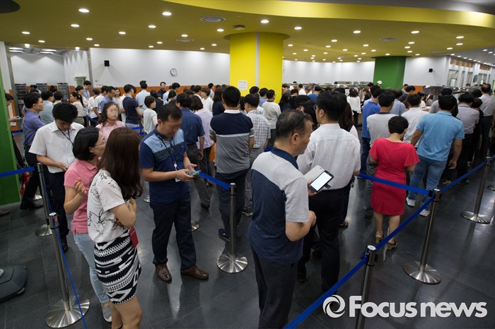 (서울=포커스뉴스) 수도권 대부분 지역에 엿새째 폭염경보가 내려진 9일 오전 서울 중구 한 구내식당이 직원들로 붐비고 있다.