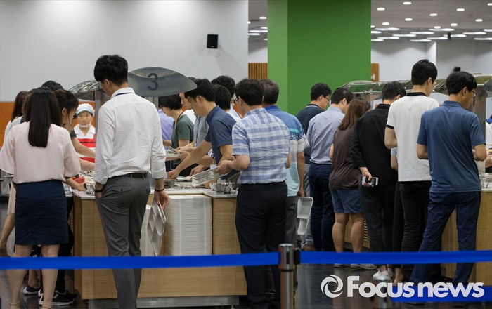 (서울=포커스뉴스) 수도권 대부분 지역에 엿새째 폭염경보가 내려진 9일 오전 서울 중구 한 구내식당이 직원들로 붐비고 있다.