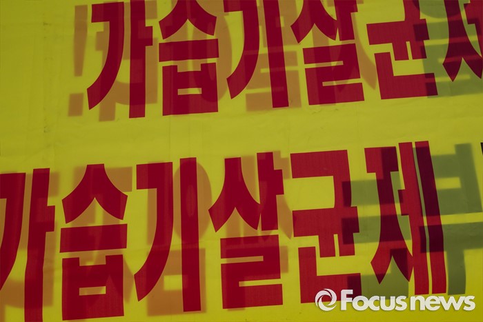 (서울=포커스뉴스) 9일 오후 서울 영등포구 옥시 한국 본사 앞에서 열린 '옥시 최종배상안 발표 규탄 집회'에 옥시의 가습기 살균제 제품 제조 및 판매를 규탄하는 현수막이 걸려있다.