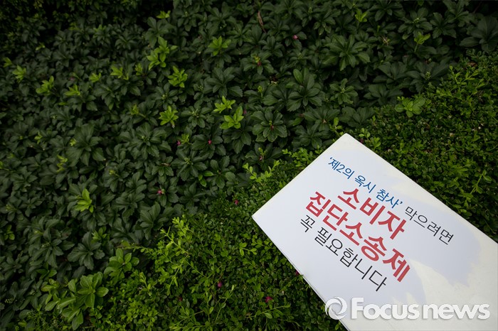 (서울=포커스뉴스) 9일 오후 서울 영등포구 옥시 한국 본사 앞에서 열린 '옥시 최종배상안 발표 규탄 집회'에 옥시 참사를 막기 위한 손피켓이 놓여져 있다.