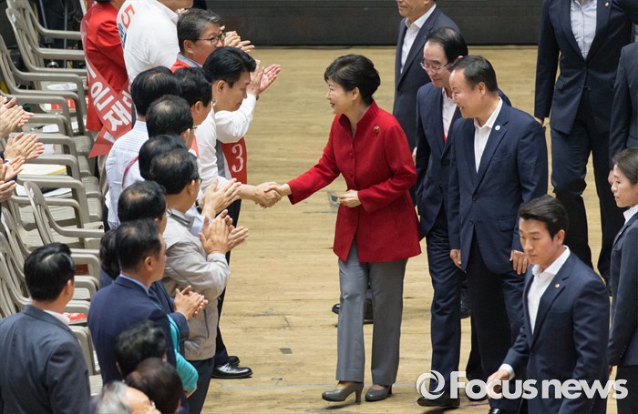 (서울=포커스뉴스) 박근혜 대통령이 9일 오후 서울 송파구 잠실실내체육관에서 제4차 새누리당 전당대회에 입장하며 당-원내대표 후보자들과 인사를 나누고 있다.