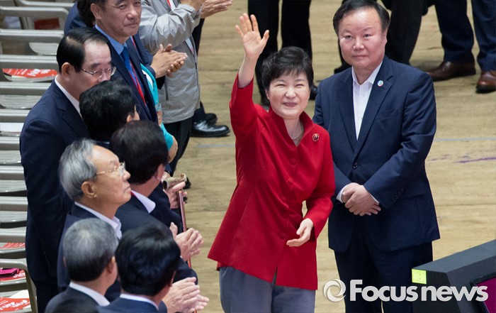이에 박 대통령은 자리에서 일어나 참여한 대의원들에 손을 흔들며 화답했다.박근혜 대통령이 9일 오후 서울 송파구 잠실실내체육관에서 제4차 새누리당 전당대회에 입장하며 인사를 하고 있다. 2016.08.09 김인철 기자