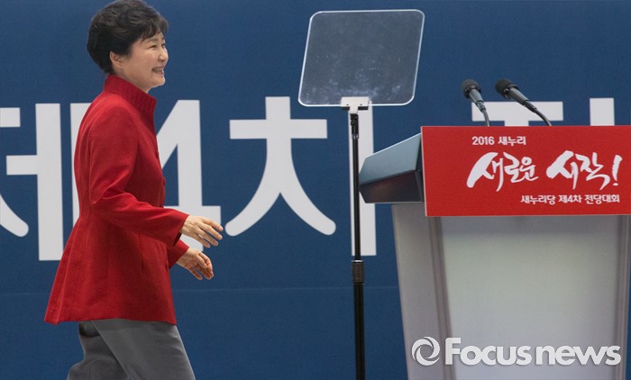(서울=포커스뉴스) 박근혜 대통령이 9일 오후 서울 송파구 잠실실내체육관에서 열린 새누리당 4차 전당대회에 참석해 축사를 위해 단상을 오르고 있다.