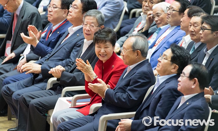 (서울=포커스뉴스) 박근혜 대통령이 9일 오후 서울 송파구 잠실실내체육관에서 제4차 새누리당 전당대회에에 참석해 내빈들과 이야기를 나누고 있다.