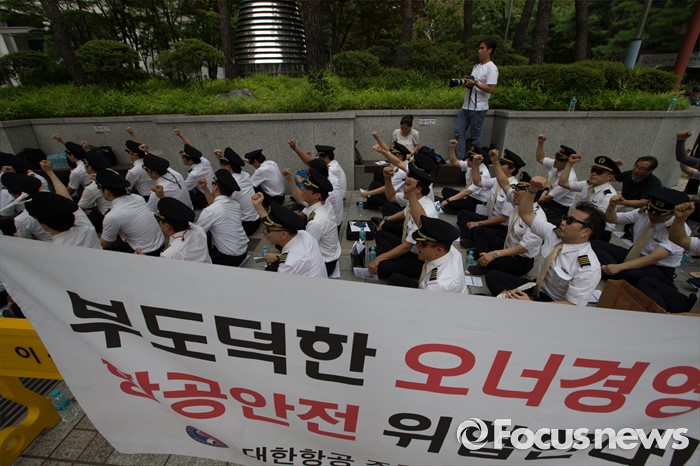 (서울=포커스뉴스) 9일 오후 서울 종로구 서울지방국세청 앞에서 열린 대한항공 경영정상화를 위한 세무조사 촉구대회에서 대한항공 조종사 노동조합 조합원들이 구호를 외치고 있다.