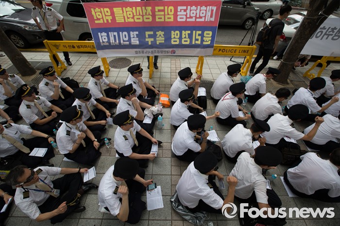 (서울=포커스뉴스) 9일 오후 서울 종로구 서울지방국세청 앞에서 열린 대한항공 경영정상화를 위한 세무조사 촉구대회에서 대한항공 조종사 노동조합 조합원들이 구호를 외치고 있다.