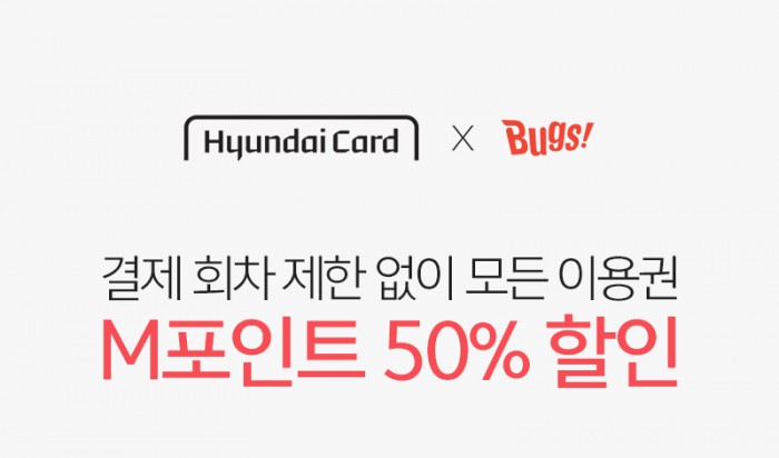 (서울=포커스뉴스) 벅스(대표 양주일)는 자사의 음악포털 벅스에서 현대카드 M포인트 결제 혜택을 기존 10%에서 50%로 확대 제공한다고 9일 밝혔다.