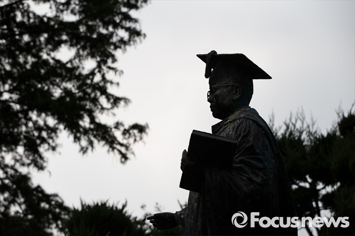 (서울=포커스뉴스) 이화여자대학교 최경희 총장이 학생들이 요구한 '9일 오후 3시까지 사퇴'를 거부한 9일 오후 서울 마포구 이화여자대학교에 초대 총장 김활란 동상이 보이고 있다.