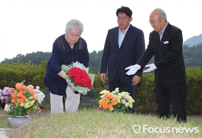 (대전=포커스뉴스) 9일 오후 대전 유성구 국립대전현충원 국가사회공헌자묘역에서 베를린 올림픽 마라톤 금메달리스트 손기정 선수의 딸 손문영 여사와 외손주인 이준승 손기정기념재단 사무총장이 손기정 선수 묘소에 80송이의 장미꽃을 헌화하고 있다. 손기정 선수는 80년 전인 1936년 8월 9일 베를린 올림픽 마라톤에서 금메달을 목에 걸었다.