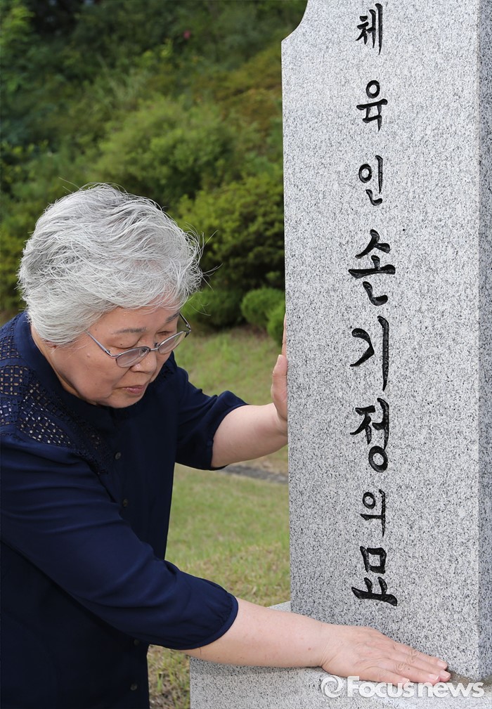 (대전=포커스뉴스) 9일 오후 대전 유성구 국립대전현충원 국가사회공헌자묘역에서 베를린 올림픽 마라톤 금메달리스트 손기정 선수의 딸 손문영 여사가 손기정 선수 묘소에 헌화를 마치고 묘비를 만지고 있다. 손기정 선수는 80년 전인 1936년 8월 9일 베를린 올림픽 마라톤에서 금메달을 목에 걸었다.