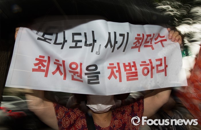(서울=포커스뉴스) 9일 오후 서울 서초구 서초역 앞에서 도나도나 피해자 모임 관계자들이 '도나도나 돼지분양 사기사건' 재수사를 촉구하는 구호를 외치고 있다.