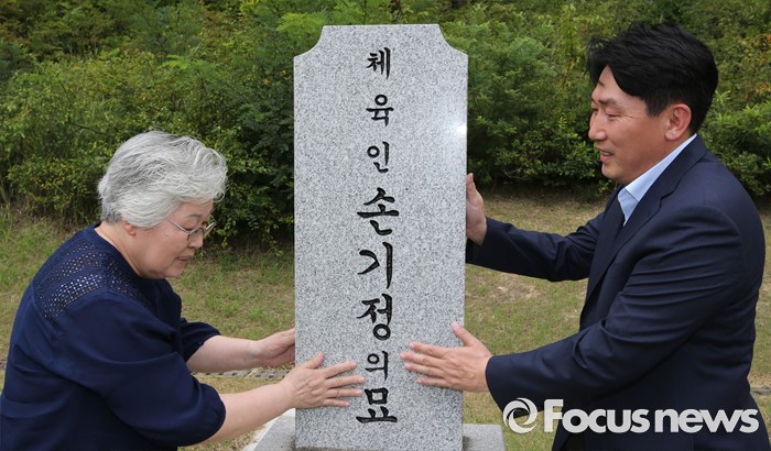 (대전=포커스뉴스) 9일 오후 대전 유성구 국립대전현충원 국가사회공헌자묘역에서 베를린 올림픽 마라톤 금메달리스트 손기정 선수의 딸 손문영 여사와 외손주인 이준승 손기정기념재단 사무총장이 손기정 선수 묘소에 헌화를 마치고 묘비를 만지고 있다. 손기정 선수는 80년 전인 1936년 8월 9일 베를린 올림픽 마라톤에서 금메달을 목에 걸었다.