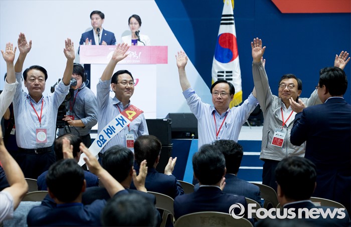 (서울=포커스뉴스) 9일 오후 서울 송파구 잠실실내체육관에서 열린 새누리당 4차 전당대회에 참석한 당대표 후보 들이 정견발표를 마친 뒤 당원들에게 인사하고 있다. 왼쪽부터 한선교, 주호영, 이주영, 이정현 후보.