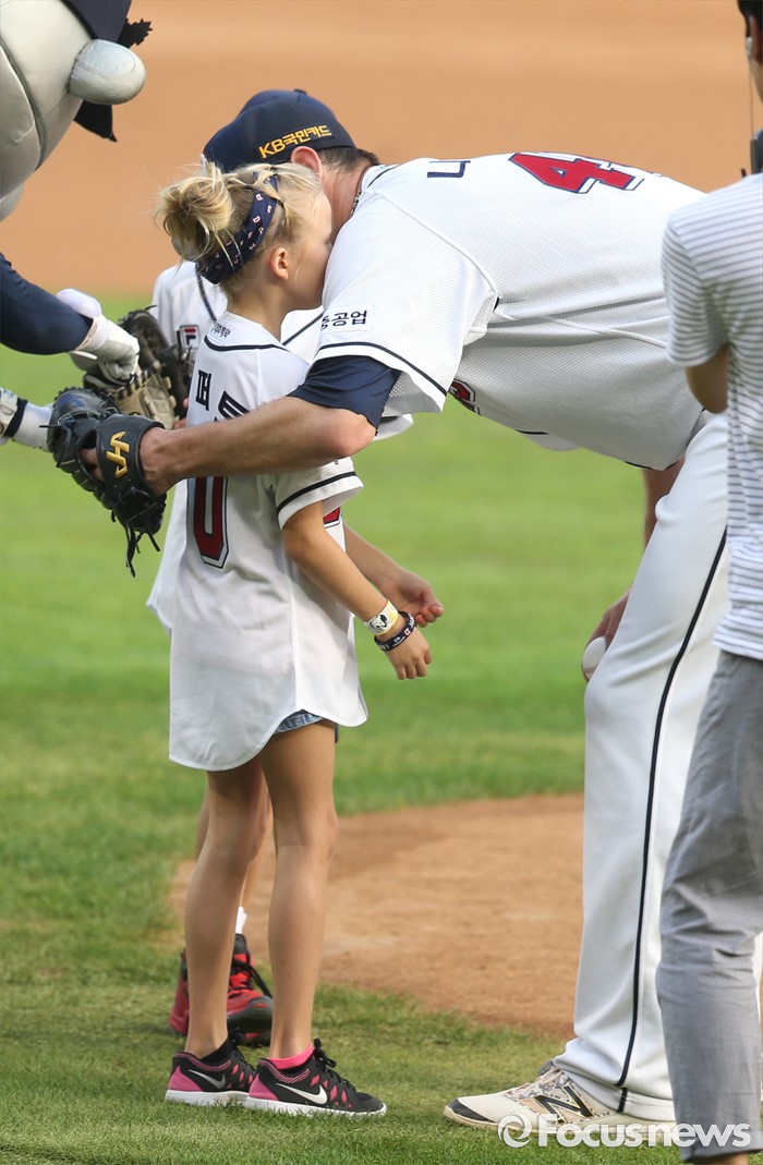(서울=포커스뉴스) 9일 서울 잠실구장에서 열린 2016 프로야구 KIA-두산 경기에 앞서 두산 투수 니퍼트가 딸 오브리의 볼에 키스하고 있다.