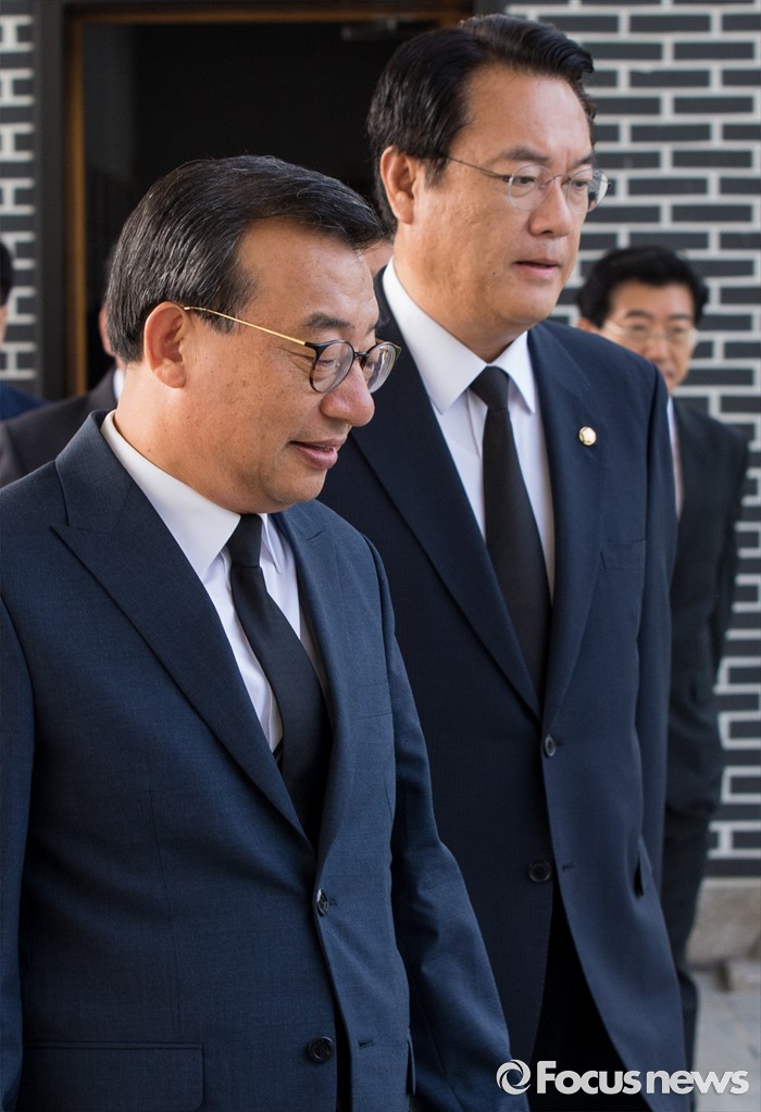(서울=포커스뉴스) 8·9 전당대회에서 새누리당 대표로 선출된 이정현(왼쪽) 대표와 정진석 원내대표가 10일 오전 서울 동작구 국립현충원 참배단으로 향하고 있다.