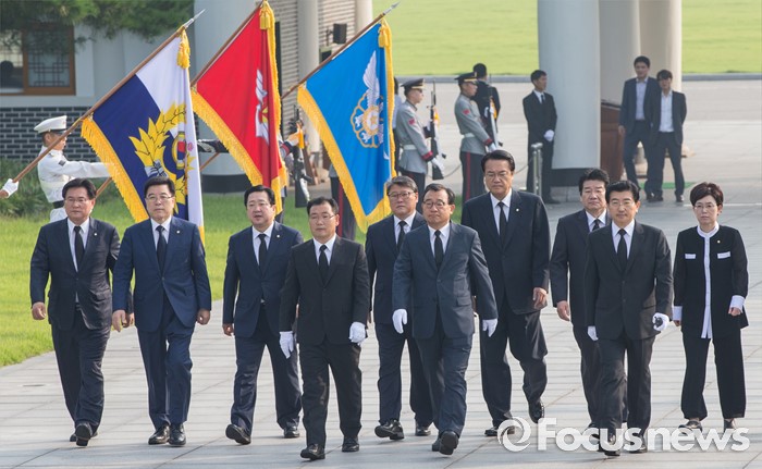 (서울=포커스뉴스) 8·9 전당대회에서 새누리당 대표로 선출된 이정현 대표가정진석 원내대표, 김광림 정책위의장, 박명재 사무총장 및 최고위원 등과 함께 10일 오전 서울 동작구 국립현충원 참배단으로 향하고 있다