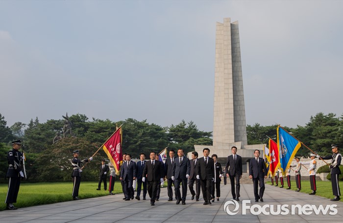 (서울=포커스뉴스) 8·9 전당대회에서 새누리당 대표로 선출된 이정현 대표가정진석 원내대표, 김광림 정책위의장, 박명재 사무총장 및 최고위원 등과 함께 10일 오전 서울 동작구 국립현충원을 찾아 참배 후 발걸음을 옮기고 있다.