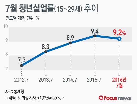 (서울=포커스뉴스) 10일 통계청이 공개한 ‘7월 고용동향’에 따르면 지난달 청년실업률(15~29세)은 올해 들어 가장 낮은 수치인 9.2%를 기록했다.