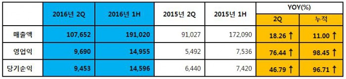 영업이익은 2분기에만 96억9000만원, 상반기 누적 기준으론 149억5500만원을 달성해 지난해 동기 대비 각각 76%와 98% 급증했다.