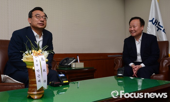 (서울=포커스뉴스) 김재원(오른쪽) 청와대 정무수석이 10일 오전 서울 여의도 새누리당 당사를 찾아 이정현 신임 대표에게 박근혜 대통령 명의의 축하 난을 전달한 뒤 대화 하고 있다.