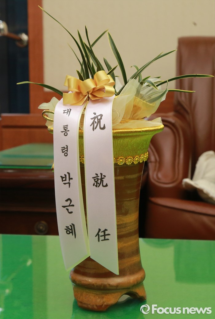 (서울=포커스뉴스) 10일 오전 서울 여의도 새누리당 당사에 김재원 청와대 정무수석이 이정현 새누리당 대표에게 전달한 박근혜 대통령 축하 난이 놓여 있다.
