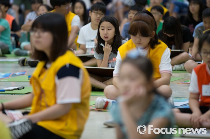 (서울=포커스뉴스) 10일 오전 서울 성동구 성동구청 대강당에서 열린 '성동 어린이 독서 골든벨'에서 초등학생들이 문제를 풀고 있다.