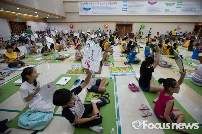 (서울=포커스뉴스) 10일 오전 서울 성동구 성동구청 대강당에서 열린 '성동 어린이 독서 골든벨'에서 초등학생들이 정답판을 들고 있다.