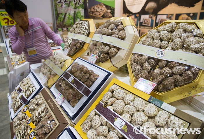 (서울=포커스뉴스) 10일 오후 서울 강남구 코엑스에서 열린 '2016 한가위 명절선물상품전'에 참가한 버섯판매업자가 진열된 버섯을 바라보고 있다.