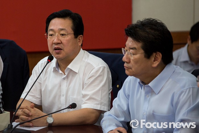 (서울=포커스뉴스) 이장우(왼쪽) 새누리당 최고위원이 10일 오전 서울 여의도 새누리당사에서 열린 최고위원회의에 참석해 모두발언 하고 있다.