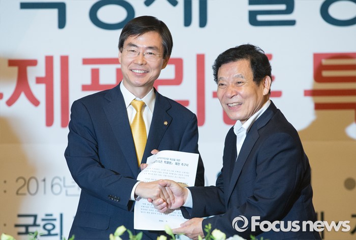 (서울=포커스뉴스) 10일 오후 서울 여의도 국회 사랑재에서 열린 지역경제 활성화를 위한 규제프리존 특별법 왜 필요한가? 간담회에 참석한 조경태(왼쪽) 기획재정위원장이 윤장현 광주시장으로부터 조속한 입법 촉구서를 전달받고 있다.