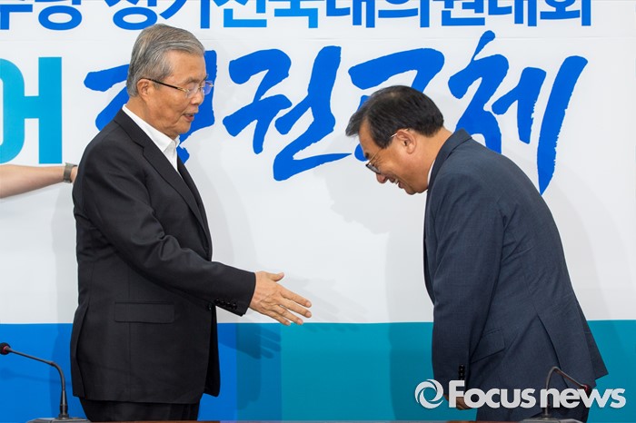 | △ 인사하는 김종인 더민주 비대위 대표-이정현 새누리당 대표 |