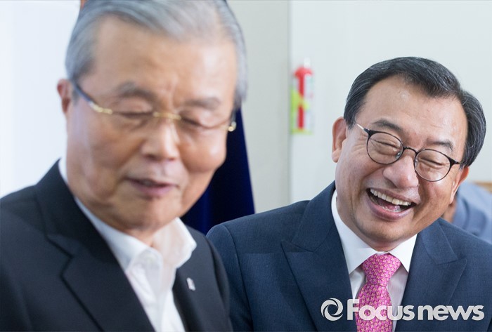 (서울=포커스뉴스) 10일 오후 서울 여의도 국회에서 이정현(오른쪽) 새누리당 신임 대표가 김종인 더불어민주당 비대위 대표와 만나 면담에 앞서 인사하고 있다.