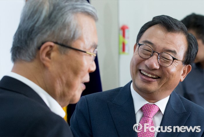 (서울=포커스뉴스) 10일 오후 서울 여의도 국회에서 이정현(오른쪽) 새누리당 신임 대표가 김종인 더불어민주당 비대위 대표와 만나 면담에 앞서 인사하고 있다.