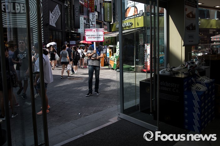 (서울=포커스뉴스) 서울시, 산업부 관계자들이 10일 오후 서울 중구 명동의 한 가게에서 에너지 절약 캠페인을 벌이고 있다. 지난 9일 폭염으로 인한 전력 수요 급증에 정부는 오는 11일부터 개문냉방 업소 단속에 나선다고 밝혔다.