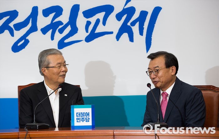 (서울=포커스뉴스) 김종인(왼쪽) 더불어민주당 비상대책위 대표와 이정현 새누리당 대표가 10일 오후 서울 여의도 국회에서 면담하고 있다.