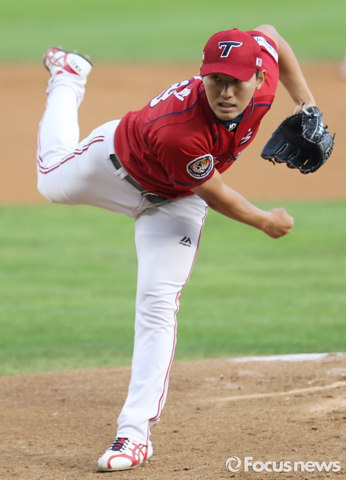 (서울=포커스뉴스) 10일 서울 잠실구장에서 열린 2016 프로야구 KIA-두산 경기에서 1회말 KIA 선발투수 홍건희가 투구하고 있다.