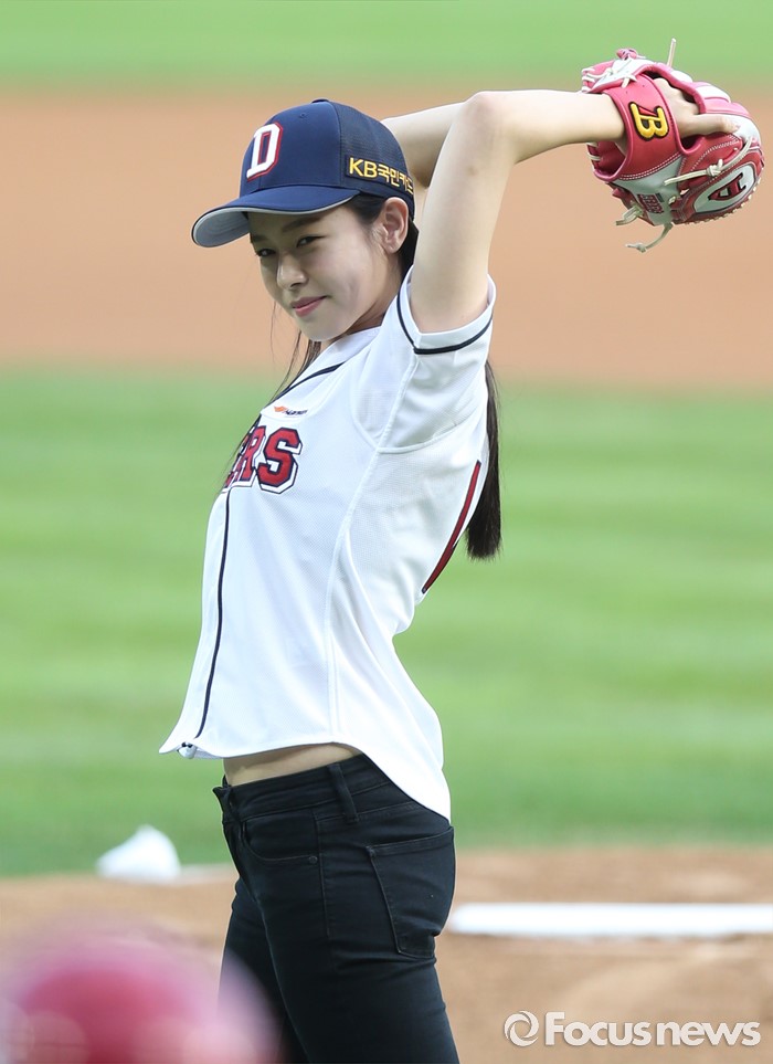 (서울=포커스뉴스) 10일 서울 잠실구장에서 열린 2016 프로야구 KIA-두산 경기에 앞서 배우 경수진이 시구하며 와인드업하고 있다.