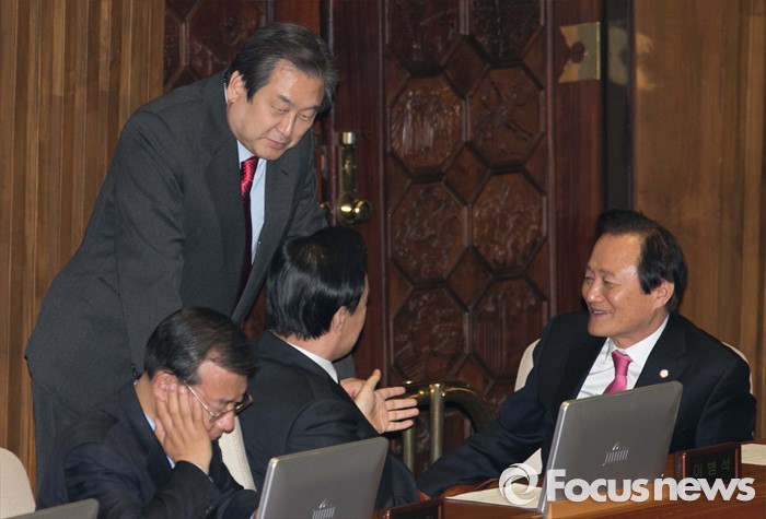 | △ 이병석 의원과 대화하는 김무성 대표 |