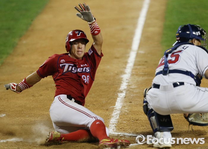 (서울=포커스뉴스) 10일 서울 잠실구장에서 열린 2016 프로야구 KIA-두산 경기 7회초 2사 1루에서 KIA 서동욱의 우익수를 넘기는 2루타때 1루주자 노수광이 홈까지 달려 슬라이딩하며 세이프되고 있다.
