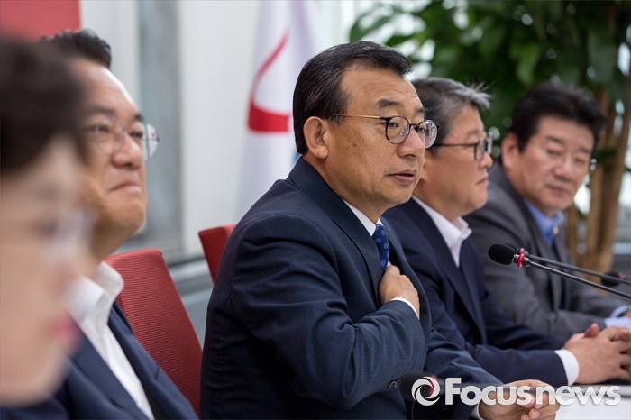 (서울=포커스뉴스) 이정현 새누리당 대표가 11일 오전 서울 여의도 국회에서 열린 최고위원회의에 참석해 취재진에게 지도부를 비롯한 최고위원의 모두발언 공개 없이 비공개 회의로 전환한다고 설명 하고 있다.
